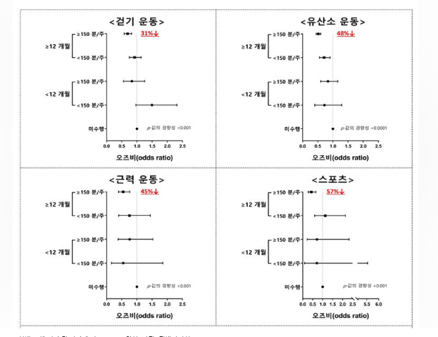 세계보건기구(WHO)는 우울증 및 불안 증상을 완화하기 위해 ‘주당 최소 150분의 유산소 운동 수행’을 권고하지만, 운동 유형과 수행 수준별로 우울증 위험 감소 효과 차이를 규명한 연구는 미비한 실정이다.